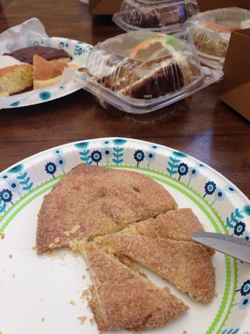 So this is what we do. We cut the item into several pieces. We then taste it and discuss it. This particular item I think was called a cinnamon elephant ear. It was very good.